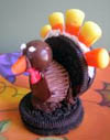 - Stick some candy corn pointy side down into the Oreo ‘stuff’ of the second cookie along one edge for the feathers. They should fan out around the edge. If necessary, use some white frosting to help them stick.